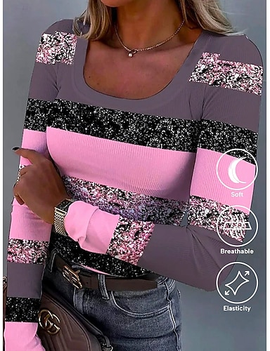 Жен. Туника Графика Геометрический принт Полоски Винтаж Мода Стиль Длинный рукав Квадратный вырез Обычные топы Повседневные С принтом Розовый Синий Бледно-розовый цвет Весна Осень Зима
