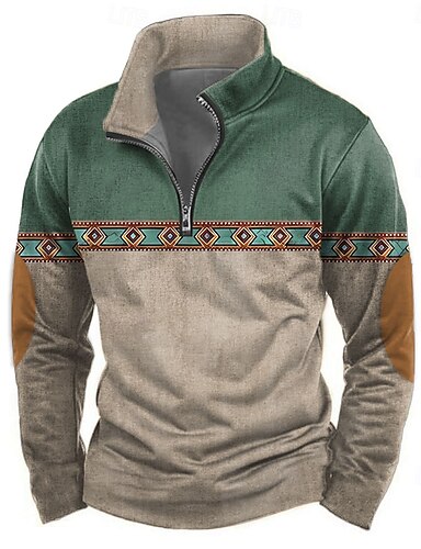 Муж. Этно Толстовка Этнический Винтаж Ретро Вырез под горло на открытом воздухе Для спорта и активного отдыха Синий Зеленый Молния Четверть молния Осень Зима Дизайнер