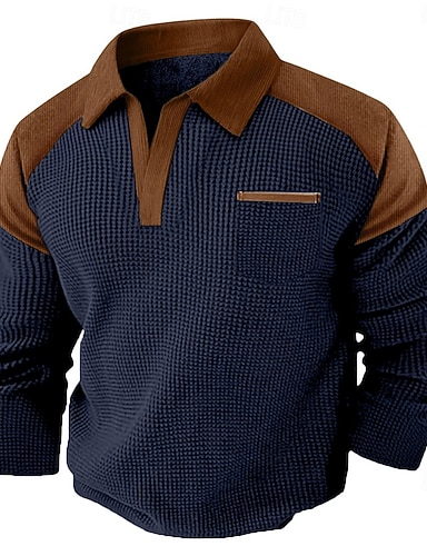 Муж. Вафельный тройник Длинный рукав V-образный вырез Лацкан Осень Весна & осень Сплошной цвет Мода Классический На каждый день Цветовые блоки Для улицы Повседневные Спорт Черный Темно синий Хаки