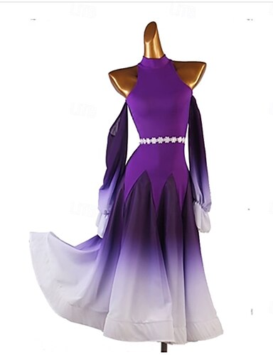 Женское фиолетовое платье для бальных танцев с эффектом омбре, с струящимися рукавами, поясом на талии и халтер-халтером — идеально подходит для латиноамериканских танцев, танго и выступлений.