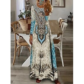 Женское Макси Платье Винтажное Бохо Платье А-силуэта С Круглым Вырезом Длинный Рукав Повседневное Обычное Прилегание Графика Геометрия Синее Оранжевое Зеленое Темно-синее Весна Осень Зима