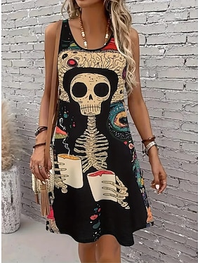 Хэллоуин скелет Женское платье с принтом черепов Мини Платье А-силуэта Летнее платье Платье на одно плечо Отпуск Повседневное Ежедневное Свободное платье Цветочное графическое Без рукавов U-вырез