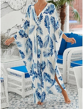 женское платье-накидка с графическим принтом листьев и v-образным вырезом, длинное платье макси, гавайское, пляжное, рукав длиной 3/4, лето