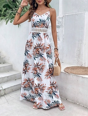 Жен. Длинное платье Платье A-силуэта Цветочное платье Летнее платье Платье на бретельках Элегантный стиль Стиль Отпуск Повседневные Свидание Стандартный Цветочный принт Без рукавов V-образный вырез