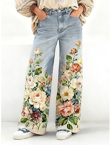 Жен. Широкие Чино Отпуск Винтаж Этнический стиль Полная длина Завышенная Цветочный принт Графика Карман Рисунок удобный Мягкий Удобный Слабоэластичная на открытом воздухе Отпуск Для улицы Синий
