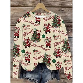 Жен. Пуловер Толстовка Графика Дед Мороз Новогодняя ёлка Мода На каждый день Длинный рукав Вырез под горло Обычные топы Для улицы На каждый день Повседневные С принтом Винный Красный Зеленый Бежевый