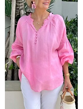 Жен. Рубашка Льняная рубашка Рубашки из хлопка и льна Полотняное плетение Стиль Современное Длинный рукав V-образный вырез Обычные топы Праздники На выход Рюши Черный Белый Розовый Лето