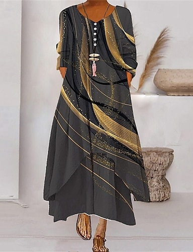 Жен. длинное платье платье макси Повседневное платье Платье с принтом Мода Современное Повседневные Пляж выходные Стандартный Графика Рукав 3/4 V-образный вырез Синий Серый Весна Осень