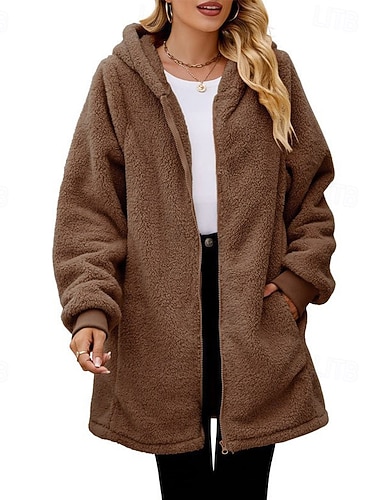Жен. Куртка из шерпа Пальто тедди Удобный Дышащий Молния Карман Пуговицы На каждый день Полотняное плетение Отпуск Для улицы Повседневные На каждый день Молния Обычная Капюшон Стандартный