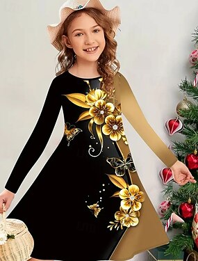 Девушки ' 3D В снежинку Деревья Платье Длинный рукав Лето Весна Отпуск Повседневные Праздники Принцесса Красивый Милая Дети 4-12 лет Повседневное платье Платье A-силуэта До колена Стандартный