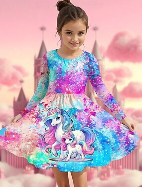 Девушки ' 3D Графика единорогом Платье Длинный рукав Лето Весна Отпуск Повседневные Праздники Принцесса Красивый Милая Дети 4-12 лет Повседневное платье Платье A-силуэта До колена Стандартный