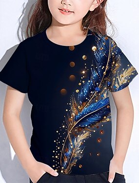 Девочки 3D Графика Перья Футболка С короткими рукавами Лето Весна Мода Классический Дети 4-12 лет Вырез под горло на открытом воздухе Повседневные Стандартный