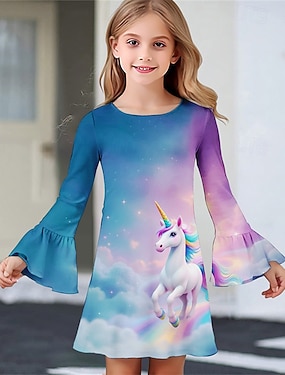 Девушки ' 3D Графика единорогом Платье Длинный рукав Лето Весна Отпуск Повседневные Праздники Принцесса Красивый Милая Дети 4-12 лет Повседневное платье Платье A-силуэта До колена Стандартный