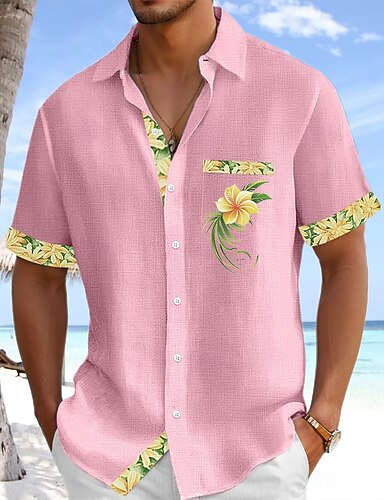 Муж. Рубашка Льняная рубашка Летняя рубашка Пляжная рубашка Кнопка рубашка Цветочные Повседневные Праздники Светло-зеленый Розовый Небесно-голубой Зеленый Короткие рукава Отложной Лето Одежда