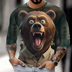 Муж. Медведи Футболка Длинный рукав Футболка 3D печать Вырез под горло Рубашка Мода Классический Для улицы Повседневные Черный Коричневый Лето Весна Одежда S M L XL XXL XXXL