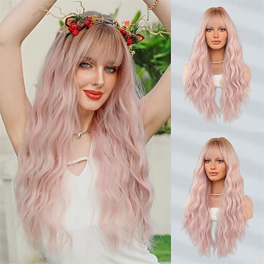 Длинный волнистый парик с розовым омбре для женщин - 26 дюймов, длинный волнистый парик с розовыми кудрями и темными корнями, термостойкие синтетические волосы, выглядящие естественно, парик из