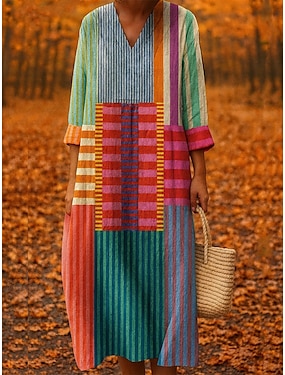 Жен. длинное платье платье макси Повседневное платье Платье с принтом Мода Современное Повседневные Пляж выходные Стандартный Геометрический принт Полоски Рукав 3/4 V-образный вырез