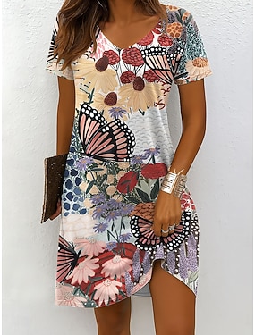 Жен. Платье средней длины Платье-футболка Сарафан Платье A-силуэта Отпуск На каждый день Пляжный стиль Пляж Стандартный Цветочный принт Графика С короткими рукавами V-образный вырез
