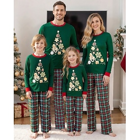 Семейный вид Новогодняя тематика Рождественская семейная пижама Пижамы Семейные наборы Графика В клетку В снежинку Дом С принтом Зеленый Длинный рукав Повседневные Подходящие наряды