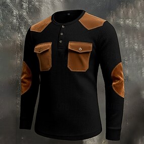 Муж. Футболка Вафельная рубашка Henley Длинный рукав Хенли Осень Наступила зима Контрастных цветов Ретро Хенли Карманы Пуговицы на открытом воздухе Повседневные Черный Серый Хаки Футболка для мужчин
