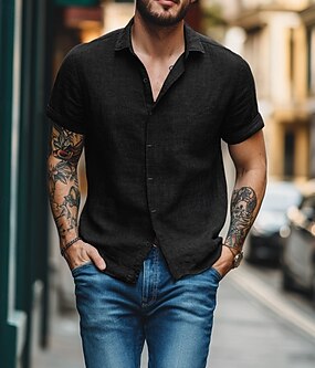 Муж. Льняная рубашка Летняя рубашка Одежда для пляжа Кнопка рубашка Рубашки навыпуск Сплошной цвет Отпуск Кьюриз Черный Белый Розовый Синий С короткими рукавами Отложной Лето Одежда Кнопка вниз