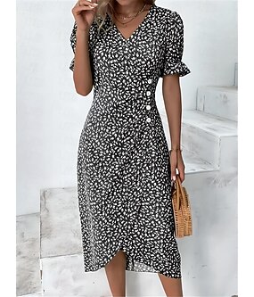 женское платье-халат с цветочным принтом и пуговицами, v-образным вырезом, миди-платье, классика, повседневное, для отпуска, с коротким рукавом, лето-весна