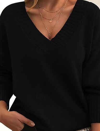 Жен. Вязаная ткань Повседневные На каждый день Сплошной цвет V-образный вырез V-образный Длинный рукав Обычные топы Вязать Офис выходные Черный Темно синий Осень Зима