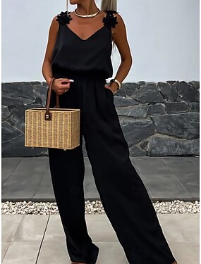 Жен. Нормальная Комбинезоны Элегантный стиль Сплошной цвет Без рукавов V-образный вырез Оборки Завышенная Для улицы Повседневные Стандартный Черный Белый Синий Лето