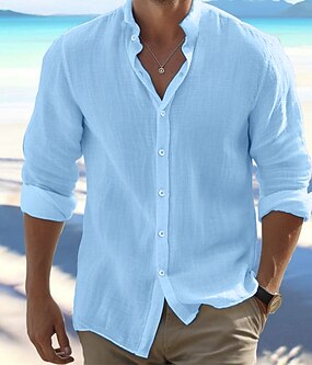 Муж. Рубашка Летняя рубашка Одежда для пляжа Кнопка рубашка Полотняное плетение Отпуск Повседневные Черный Белый Розовый Синий Длинный рукав Воротник-стойка Весна лето Одежда