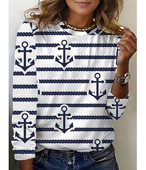 Футболка для женщин с круглым вырезом длинным рукавом туника океан повседневная обычные топы для повседневной носки уикенд печать синяя светло-голубая