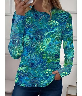 Женская Футболка Длинный Рукав Круглый Вырез Длинный Рукав Туника Повседневная Печать Регулярные Топы Повседневная Синяя Фиолетовая Хаки Весна Осень Предосень