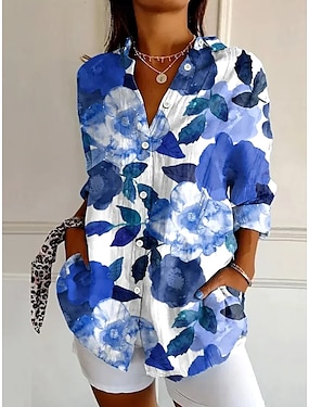 Женская рубашка с пуговицами туника воротник длинный рукав цветочный графический рисунок винтажный тропический повседневные обычные топы для работы повседневные праздничные с принтом синий весна