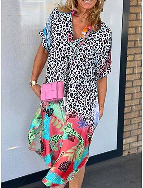 Жен. длинное платье платье макси Сарафан Летнее платье Винтаж Стиль Отпуск Повседневные Свободное облегание Графика Леопард С короткими рукавами V-образный вырез Розовый Синий Оранжевый Коричневый