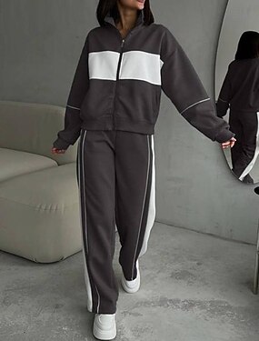 Жен. Комплекты спортивных костюмов с пуловерами Спортивный костюм из двух частей Наряды для отдыха мешковатый Контрастных цветов Наборы одежды Осень Черный Белый