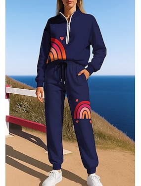 Жен. Спортивный костюм Тренировочный костюм Балахон на молнии Кулиска Молния Геометрический принт Куртка и спортивные штаны Комплект спортивной одежды Весна Темно-синий
