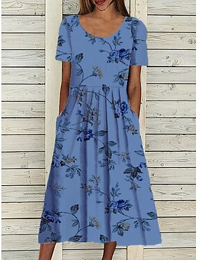 Женское миди-платье Повседневное платье Цветочный принт Рюша Принт Круглый вырез Основное Повседневное Ежедневное Короткий рукав Летнее Весеннее