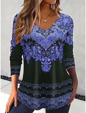 Жен. Футболка Графика Этно Винтаж Мода Стиль Длинный рукав V-образный вырез Асимметричная шея Обычные топы Повседневные выходные Одежда для отпуска Пуговицы С принтом