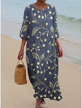 Женское макси-платье кафтан 3/4 длина рукава круглый вырез повседневное платье-шифт А-силуэт платье бохо для повседневной и праздничной носки графический цветочный темно-желтый светло-розовый желтый