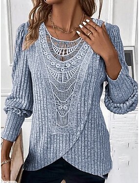 Жен. Блуза Сплошной цвет Элегантный стиль Стиль Классический Длинный рукав Вырез под горло Обычные топы Повседневные Кружева Пэчворк Синий Лиловый Зеленый Весна Осень Зима