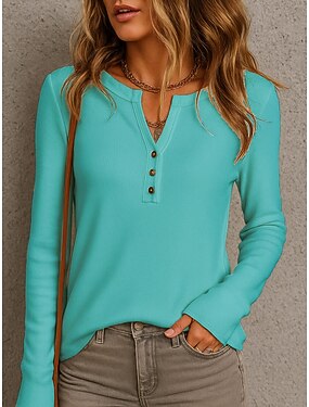 Жен. Рубашка Блуза Сплошной цвет Классический На каждый день Длинный рукав V-образный вырез Обычные топы Повседневные Пэчворк Пуговицы Розовый Синий Бежевый Осень Зима