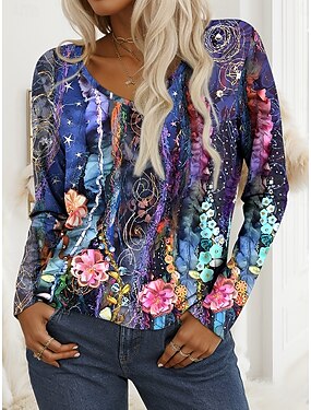 Женская футболка с V-образным вырезом длинными рукавами туника цветочная графическая растения винтажная стильная повседневная обычная печать на выходные розовый синий оранжевый весна осень
