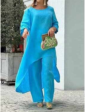 женские комплекты из двух предметов, вдохновленные льном, модные, простые, повседневные, для улицы, свидания, аэропорта, дышащие, с круглым вырезом, с длинным рукавом, летние, весенние, домашние наряды