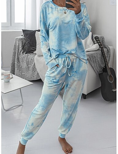 Жен. пижама На каждый день Удобная обувь Узоры тай-дай Эластичная талия Футболка Брюки Дом Повседневные Длинный рукав Вырез под горло Розовый Синий Зеленый Цвет радуги Серый Лето Весна Осень