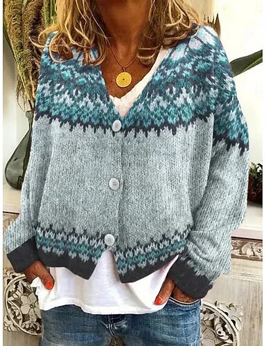 Жен. Вязаная ткань Кардиган Элегантный стиль Мода Уличный стиль Графика Геометрический принт V-образный вырез Пуговицы Трикотаж С принтом Длинный рукав Обычные топы Вязать
