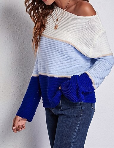 Жен. Пуловер На каждый день Контрастных цветов коренастый С открытыми плечами Трикотаж Длинный рукав Обычные топы Вязать Повседневные Праздники На выход Синий Осень Зима