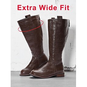 Женские коричневые сапоги до колена очень широкой посадки с меховой подкладкой и застежкой-молнией, универсальные и прочные, подойдут для повседневных образов, а также для осенне-зимнего сезона.