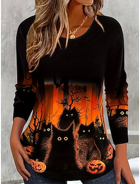 Хэллоуин Женская Футболка Графика Черная Кошка Кот Тыква Винтаж Мода Стильная Длинный Рукав Круглый Вырез Обычные Топы Повседневная Уикенд Печать Черный Белый Розовый Синий Фиолетовый Весна Осень Зима