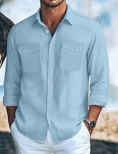 Муж. Рубашка Льняная рубашка Летняя рубашка Одежда для пляжа Кнопка рубашка Сплошной цвет Отпуск Для улицы Белый Синий Зеленый Цвет хаки Длинный рукав С отворотом Лето Весна Одежда Карман