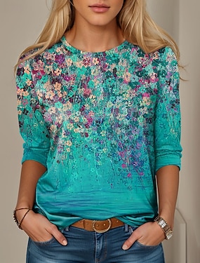Женская футболка Повседневная Базовая Цветочный Принт 3/4 Длина Рукава Обычные Топы Круглый Вырез Повседневная Праздничная Зеленая Осень и Зима