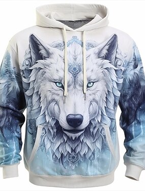 Муж. Графика Животное Волк Толстовка Худи Мода Повседневные Длинный рукав Капюшон Отпуск Для спорта и активного отдыха Праздники Синий Темно-синий С принтом Передний карман Весна & осень Дизайнер